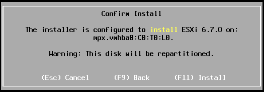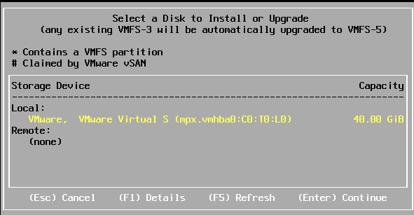Connect into your ESXi vm and we'll walk through the install process. This installation is straight forward, first off you'll select the storage device that you'd like to install ESXi on. Select the 40GB disk we created during the vm configuration.