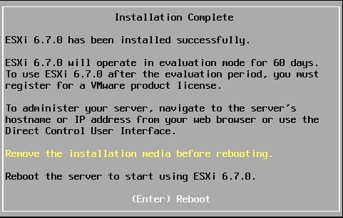Once complete, you'll be prompted to remove your install media. Navigate to your virtual machine settings and disconnect your CD/DVD device. More than likely you won't need it anymore, but if you do you'll just need to reconnect it. Push enter when you're ready to reboot.