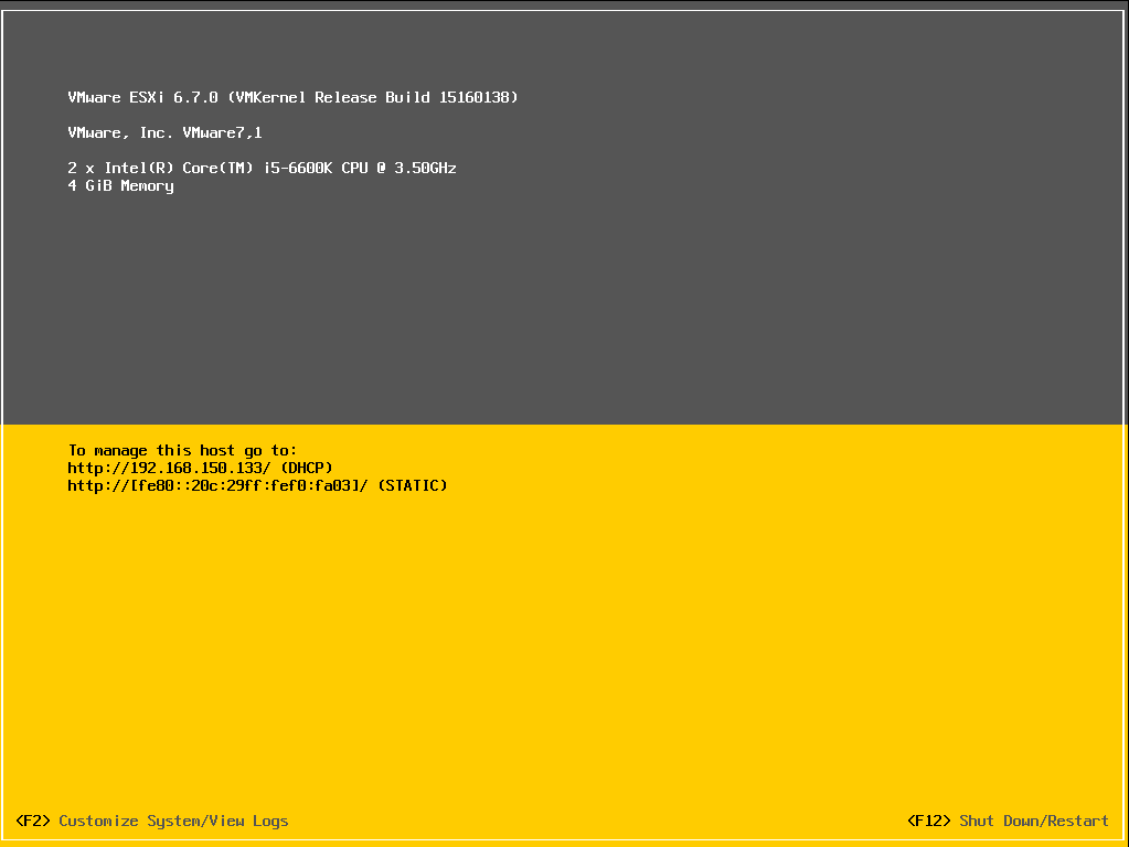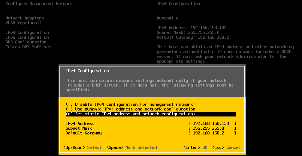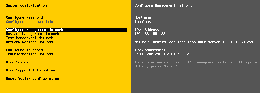 As you can see our ESXi host has a DHCP address, we should now be able to connect into it via the URL provided. You'll want to set a static IP while we're in here, leaving it DHCP could lead to major problems after we have our lab up and running. So push F2 and navigate to Configure Management Network and then IPv4 Configuration.