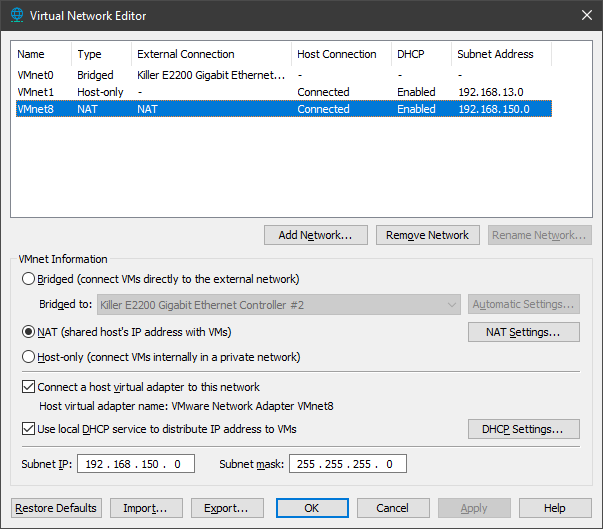 Navigate to Edit > Virtual Network Editor. Here we'll want to setup the type of network our lab is communicating over. Since I want to manage these resources not only through VMwware workstation, but also from my local computer, I setup a NAT network. Add the network that's appropriate for what you're trying to accomplish.