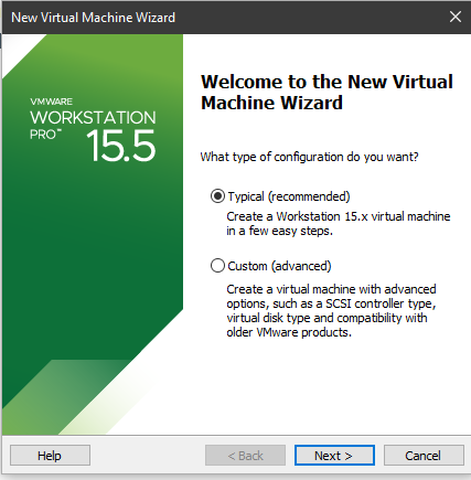 Now you're ready to create your first VM (File > New VM). Select Typical and then next.