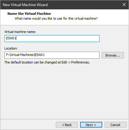 Give your VM a meaningful name, so as you expand your lab you can keep everything straight. Also select the storage location you want to use. I'll be using one of my secondary data drives, and not the one that's slower than a snail. Remember, these virtual hard drives are going to be acting as just that, hard drives. So if you put them on slow storage you're going to experience significant slow downs. Especially during the deployments of ESXi and vCenter.