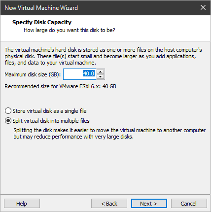 Next select your disk size and whether you want to use a single file or multiple files. In my lab I'm keeping the default to divide up the disks. Click next when you're done. Note: you'll need to add an additional 300GB disk to your ESXi servers. If you don't have the actual space for it, no problem, we'll be thin provisioning it so we'll only take up what's actually being used. Why 300GBs? Well vCenter requires at least a 300GB disk and it will not deploy successfully if you don't have it.